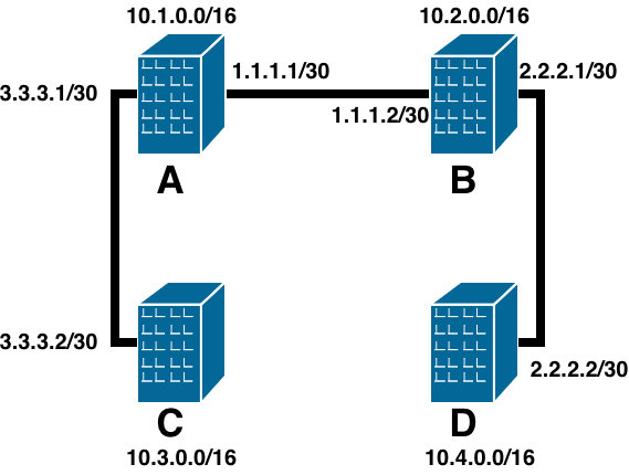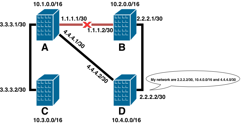 Maintenant, si jamais j’ajoute un nouveau lien entre A et D, les routes sont absolument les mêmes et je ne profite pas de cette nouvelle optimisation (et ça devient réellement problématique si le lien entre A et B tombe en panne, car A ne pourra plus joindre D).