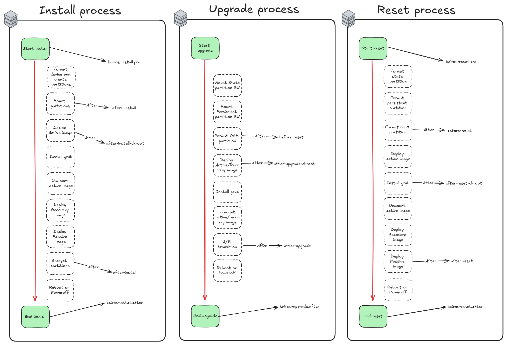 Kairos utilise un système de “stages” pour organiser les différentes étapes de configuration et d’installation. Chaque stage peut contenir plusieurs actions qui seront exécutées dans un ordre spécifique, nous avons aussi la possibilité de définir des actions durant des phases spécifiques du boot (initramfs, boot, post-boot, etc.).